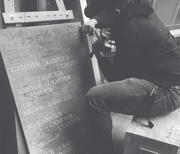 Cyprien Grégoire, graveur lapidaire, allie la tradition à l'innovation. Fort d'une formation auprès du Meilleur Ouvrier de France (Rodolphe Giuglardo) en taille de pierre et dessin typographique, et d'un master en graphisme et typographie, je mets mon expertise au service de vos projets les plus ambitieux.